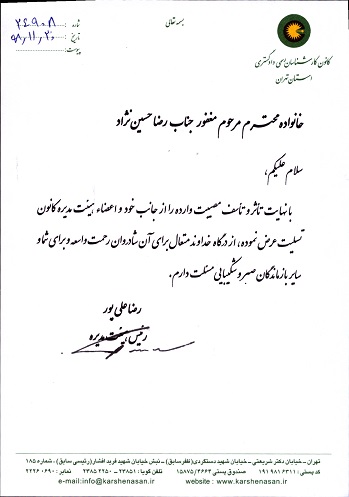 رياست كانون تهران طي نامه اي درگذشت مرحوم مغفور رضا حسين نژاد را تسليت گفتند.